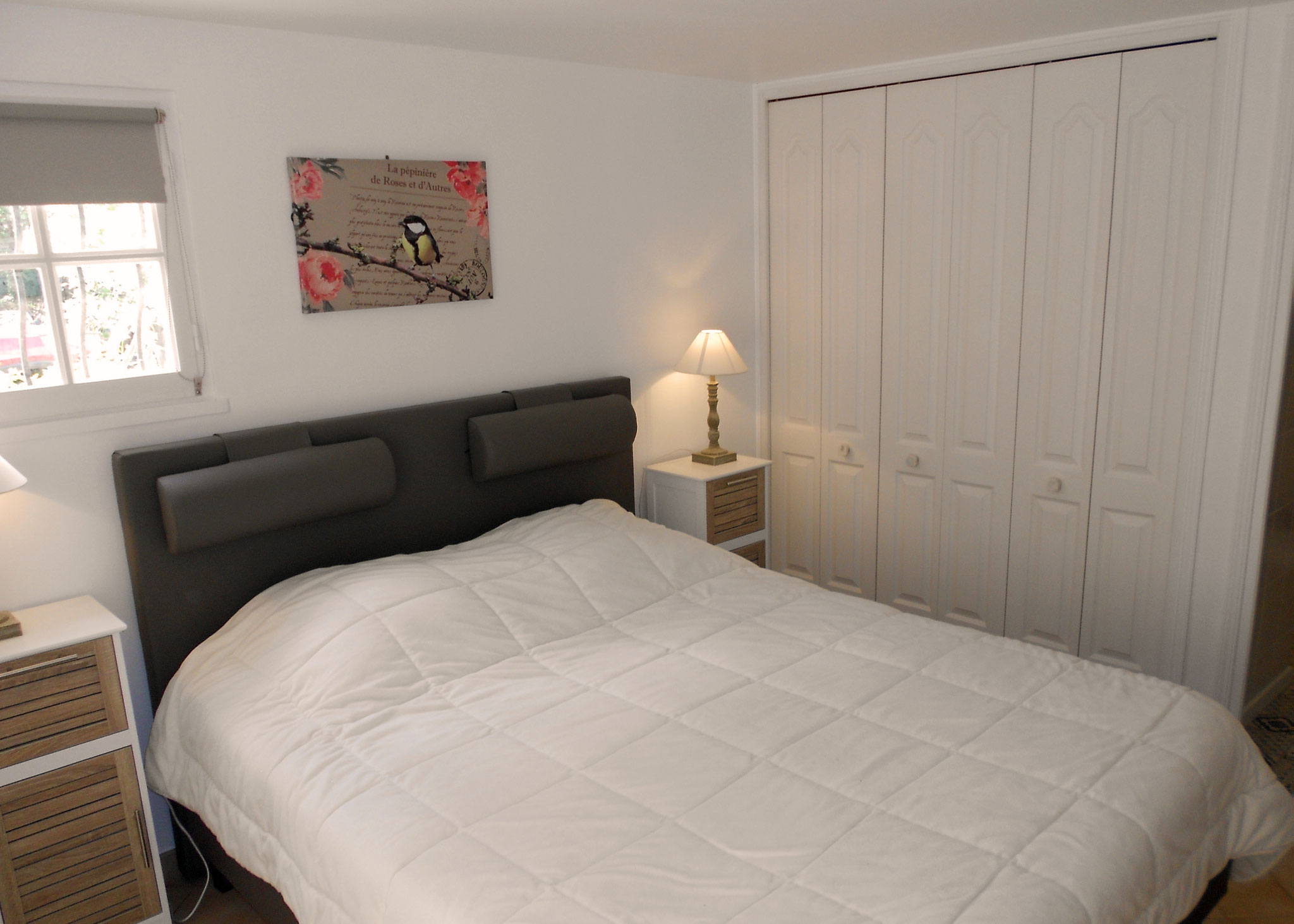 The room has a double bed, small fridge, coffee maker and kettle.