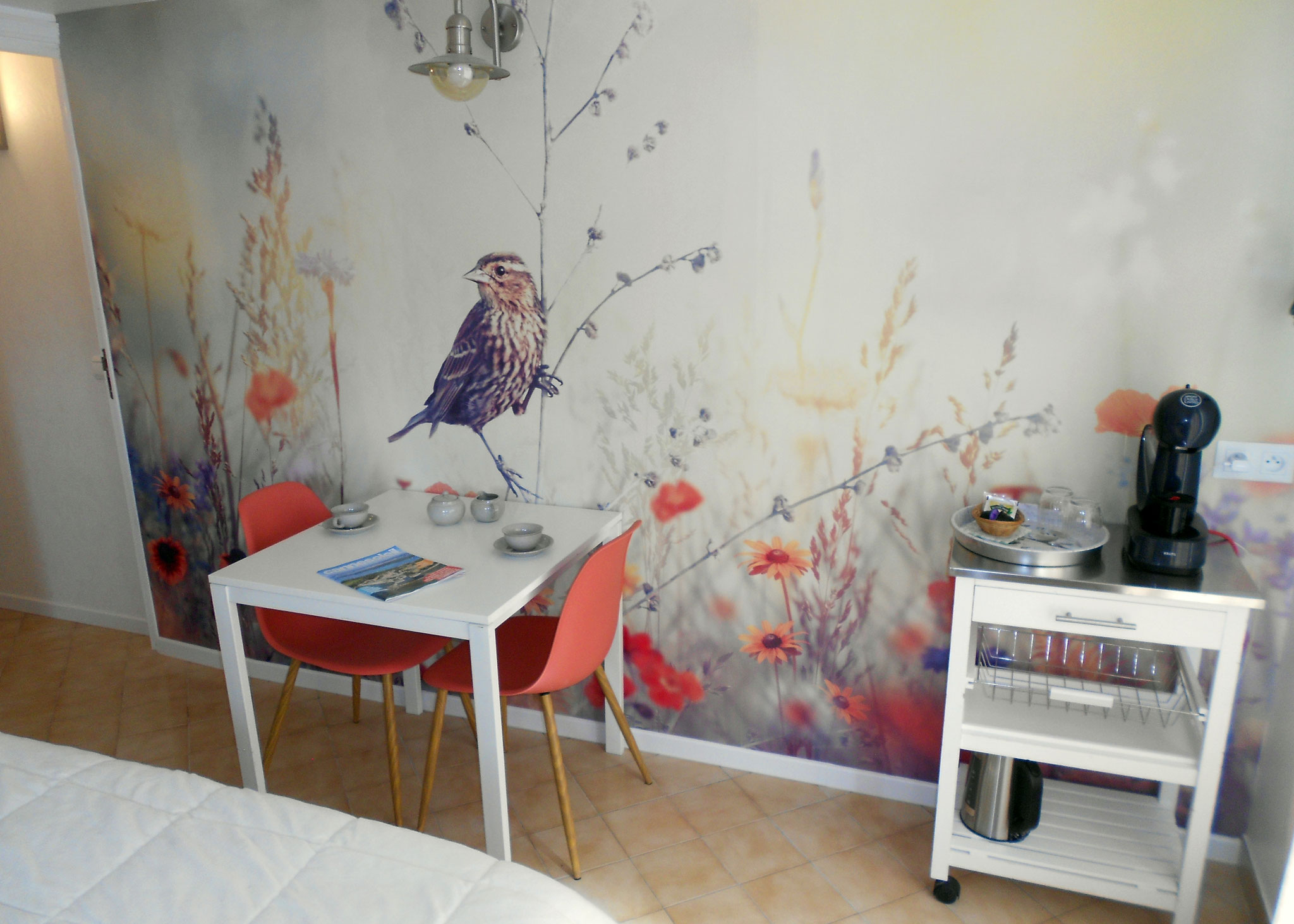 Ausgestattet mit einem Doppelbett, kleinem Kühlschrank, Kaffeemaschine und Wasserkocher.