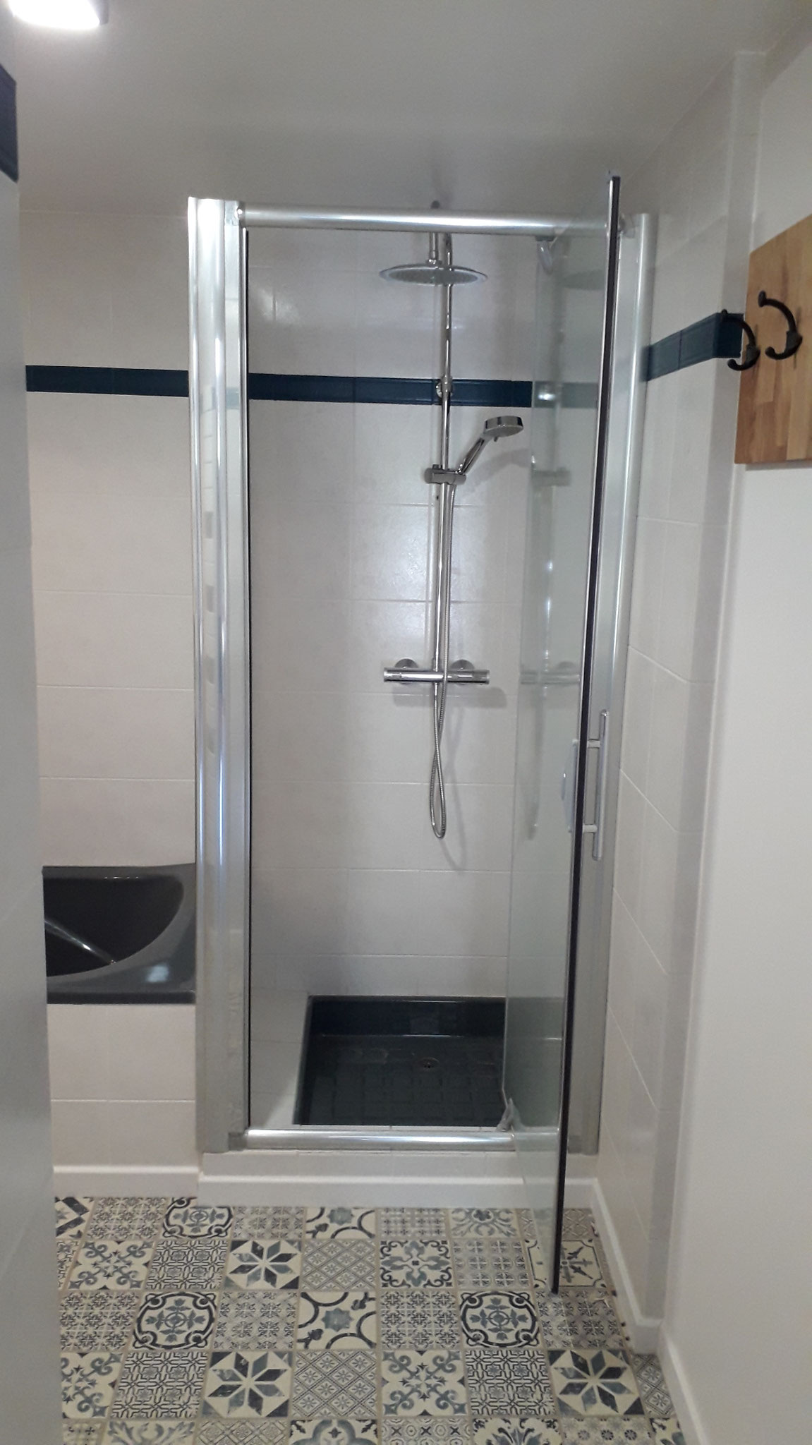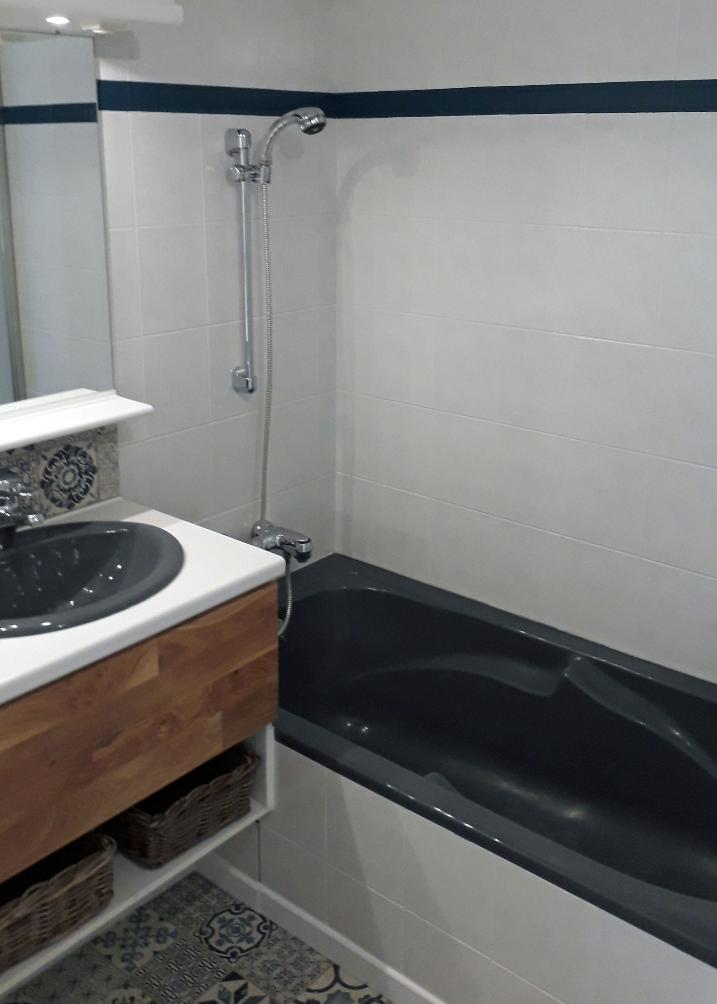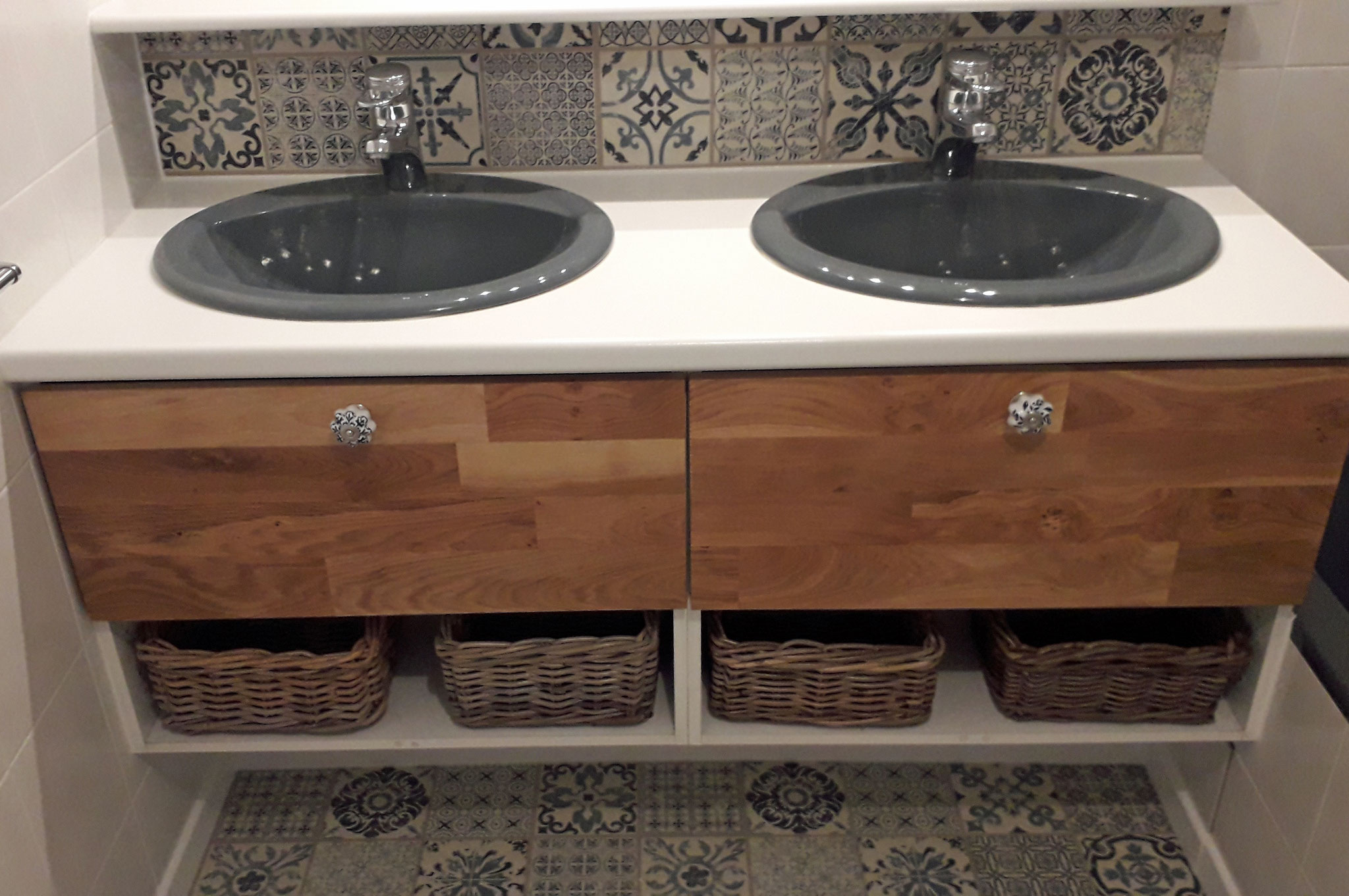 Das Badezimmer ist mit einer Dusche, einer Badewanne, einem Doppelwaschbecken und einer separaten Toilette ausgestattet.