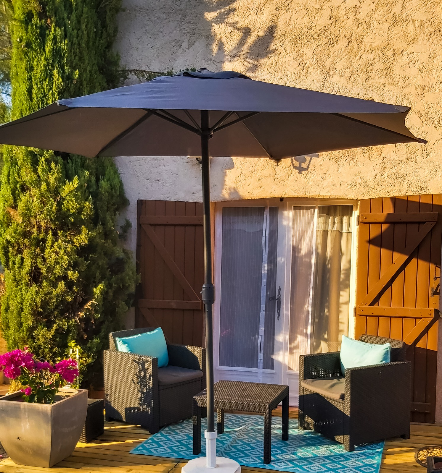 Außenterrasse mit Gartenmöbeln.